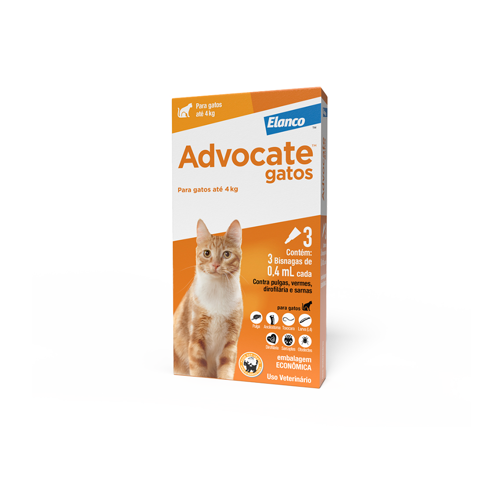 Tratamento topico, de facil administracao, sem estresse, uma unica dose de Advocate™ e rapida e eficiente no controle das pulgas e elimina os vermes adultos no intestino e os estagios jovens dos vermes, que podem migrar para outros orgaos interrompendo assim o ciclo de vida do parasita. Advocate™ trata e previne as sarnas otodecica, sarcoptica e demodecicas dos gatos.