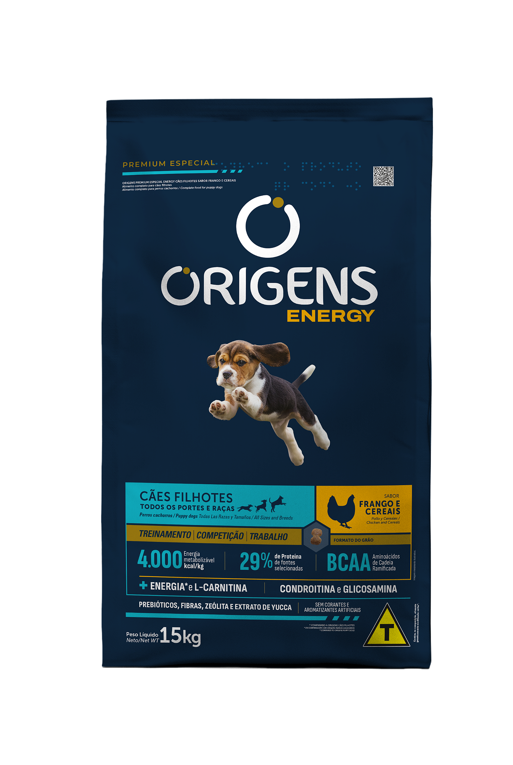 Origens Energy Filhotes é indicada para cães em desenvolvimento, que necessitam de uma dieta rica em proteína e energia, beneficiando-se da inclusão de aminoácidos que auxiliam na recuperação e síntese muscular, o que favorece a alta performance. Ingredientes: Farinha de vísceras de aves, farinha de torresmo, concentrado proteico de soro de leite, ovo em pó, farelo de glúten de milho 60*, óleo de aves, hidrolisado de fígado de aves e suíno, farinha de batata-doce, milho moído*, farelo de trigo, cloreto de sódio, polpa de beterraba, grão de linhaça, maçã desidratada, vegetais desidratados (cenoura e espinafre), biomassa de microalgas (Schizochytrium sp.), L-carnitina sulfato de condroitina (0,005%), sulfato de glicosamina (0,04%), levedura de cana-de-açúcar hidrolisada e desidratada, frutooligossacarídeos, galactooligossacarídeos, parede celular de levedura, hexametafosfato de sódio, extrato de yucca (0,05%), zeólita (0,1%), vitaminas (A, D3, E, K3, B1, B2, B5, B6, B12, C, niacina, ácido fólico, biotina, cloreto de colina), minerais (sulfato de ferro, sulfato de cobre, sulfato de manganês, sulfato de zinco, iodato de cálcio, selenito de sódio, organozinco, organoselênio, organomanganês), ácido propiônico, BHA (Butilhidroxianisol) e BHT (Butilhidroxitolueno). Contém, na composição, alimento geneticamente modificado: milho*. Espécies doadoras de gene: Agrobacterium spp.*, Bacillus thuringiensis*, e Streptomyces spp.*.