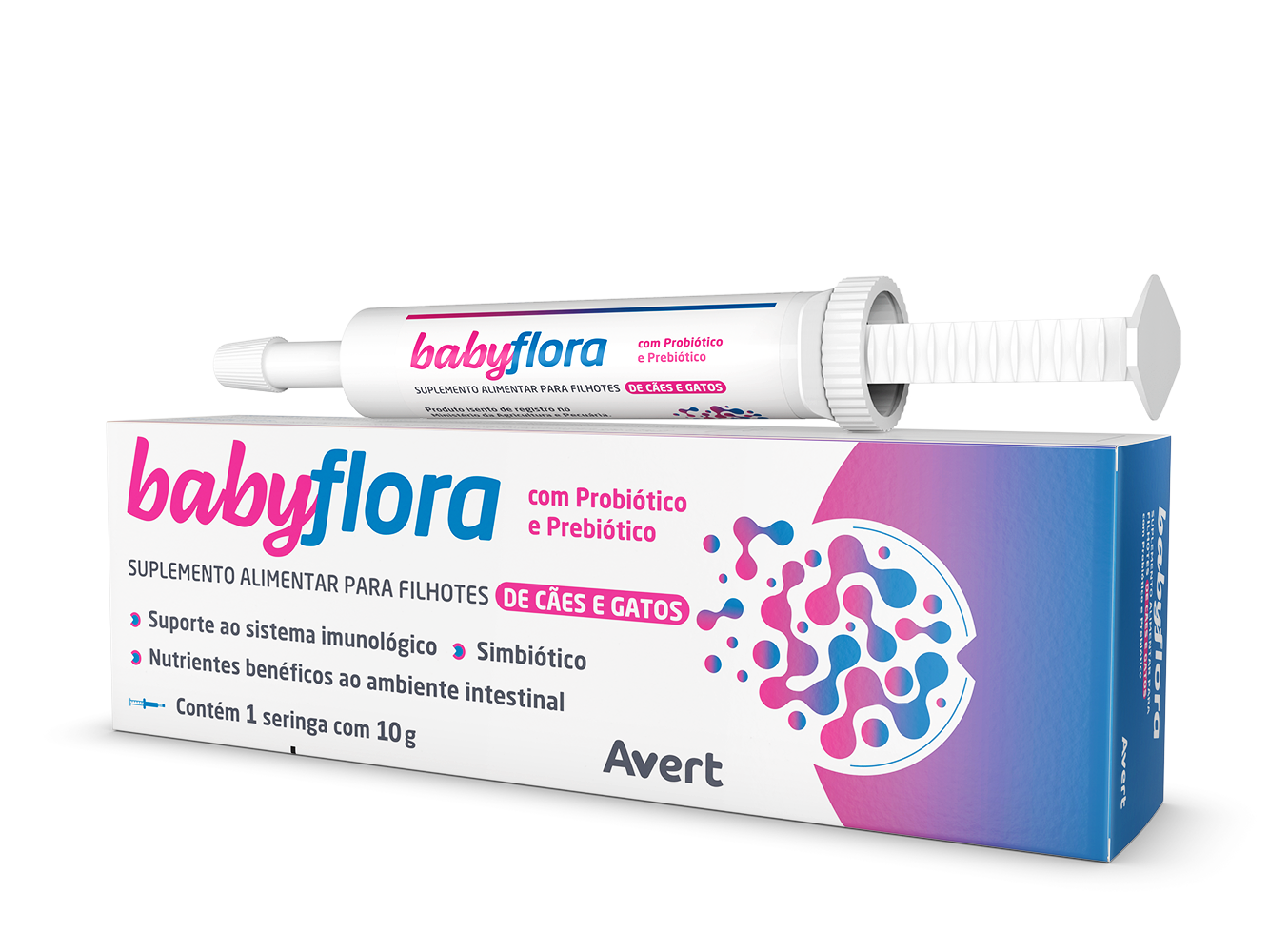 BABYFLORA e um suplemento alimentar composto pela associacao de probioticos, prebioticos inulina, FOS e ovo, indicado para filhotes de caes e gatos. Auxilia no equilibrio da microbiota intestinal e suporte ao sistema imunologico.
